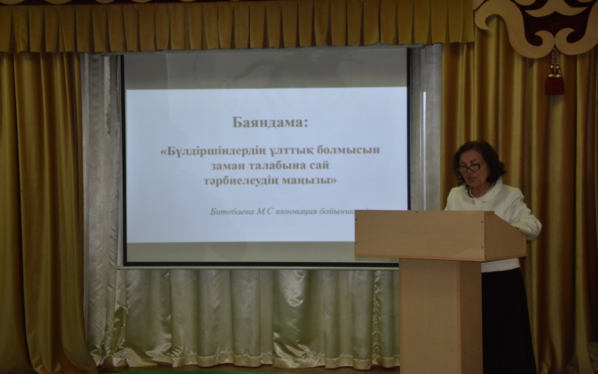 Семинарға қатысушыларға алдымен осы тақырыптың теориялық және заманауи негізі жайлы мазмұнды да ықшам, тартымды түрде «Балалардың ұлттық болмысын заман талабына сай тәрбиелеудің маңызы» тақырыбындағы баяндама ұсынылды . (баяндамашы инновация бойынша әдіскер Битебаева М. С.)